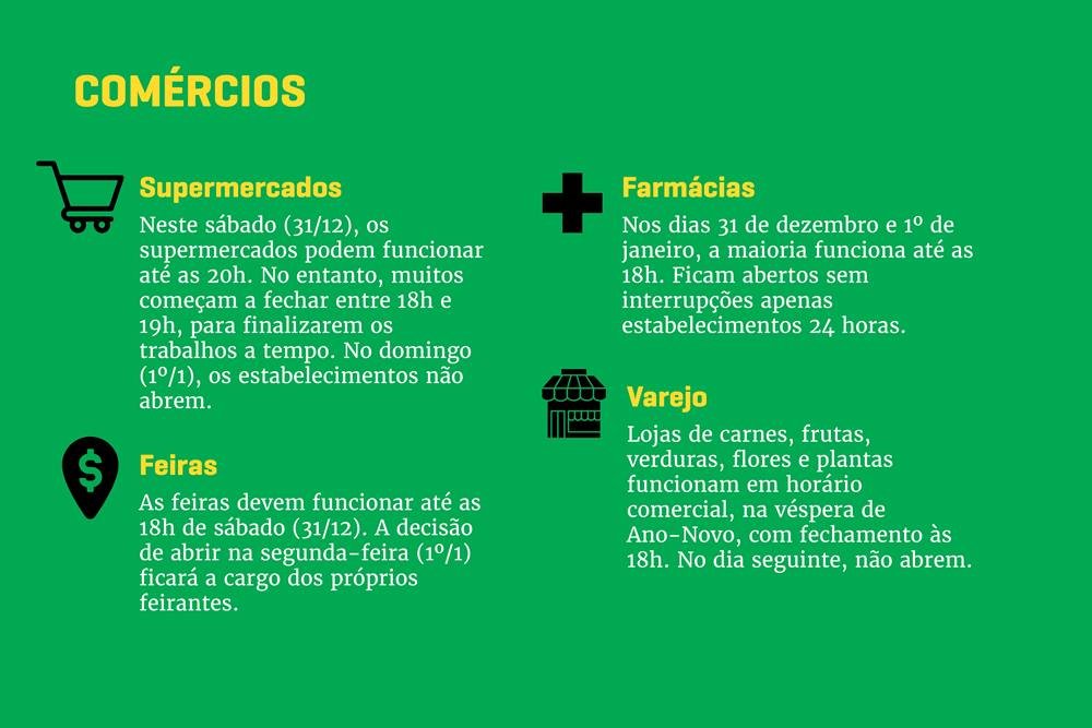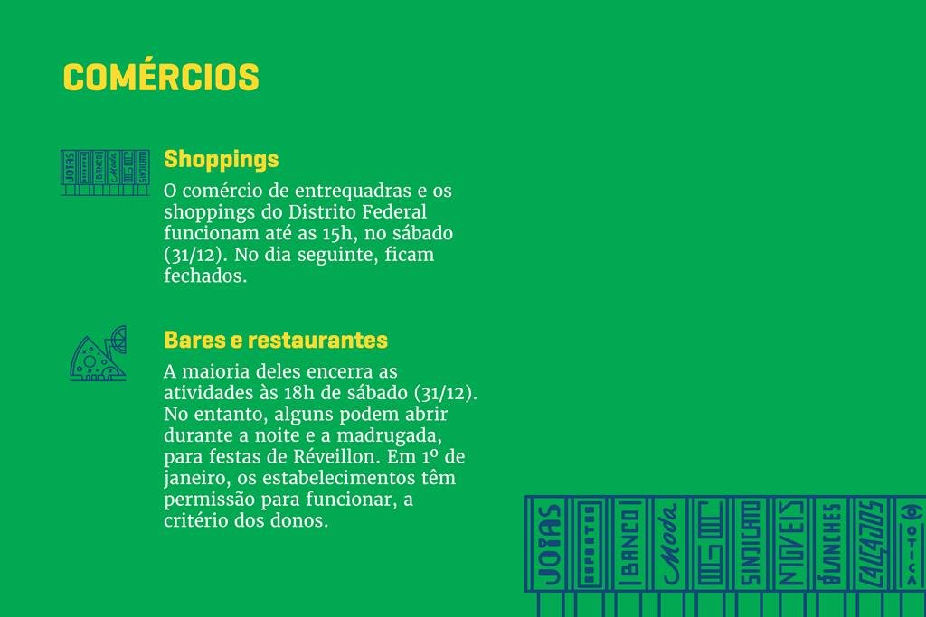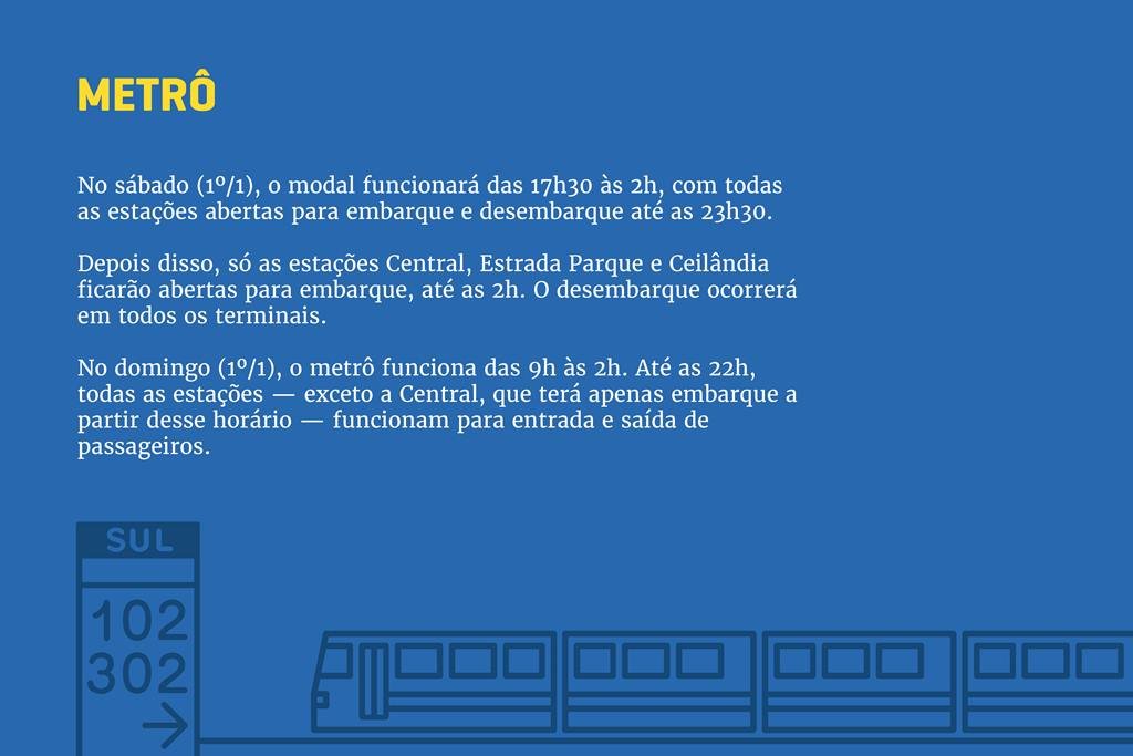 Devido às comemorações de Ano-Novo e às solenidades de posse dos governos local e federal, os serviços públicos na capital da República terão horários diferentes de funcionamento neste sábado (31/12) e no domingo (1º/1). Confira: