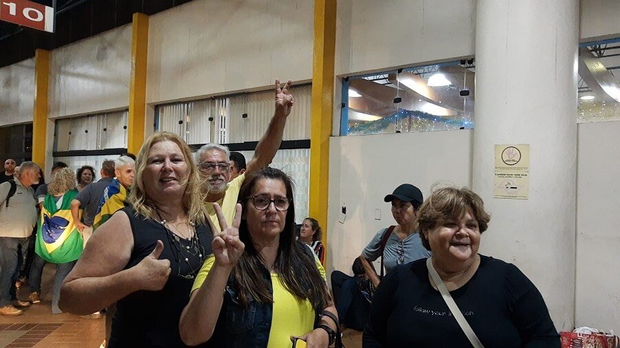 Por volta das 19h do sábado (7/1), um grupo carregando malas, travesseiros e bandeiras do Brasil posava para fotos em frente ao ônibus fretado para a dívida à capital federal.