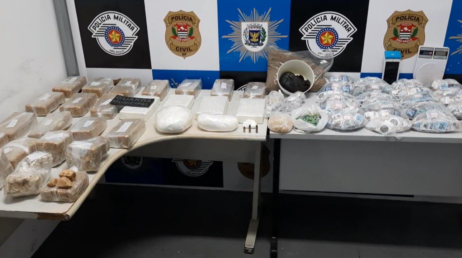 No local havia um barraco, onde os guardas localizaram 26 tijolos de crack, uma lata de tinta com pasta base, haxixe, munições, balanças de precisão e máquinas de cartão de crédito. O material foi apreendido e ninguém foi preso.